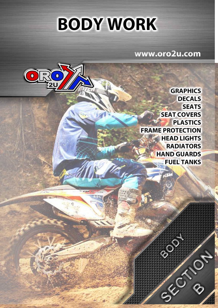 ORO2U Dirt Catalogue - ATV Section B - Body Work Section Graphics, Decals, Seats, Seat Covers, Plastics, Frame Protection, Head Lights, Radiators, Hand guards, Fuel Tanks.